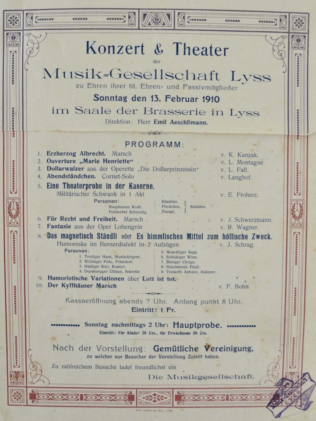 Konzertprogramm vom 13.02.1910 (Archiv der MG Lyss).